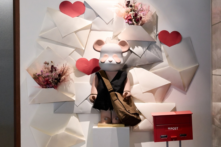Un panda vestido con uniforme de cartero te dará la bienvenida.