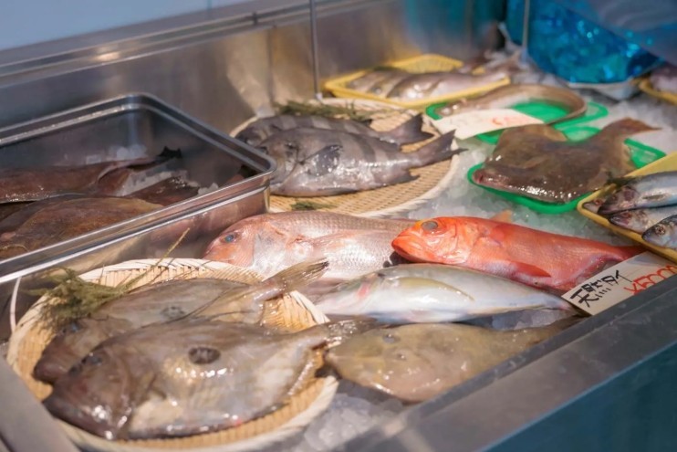 Al cruzar la cortina noren de Shihachi Fresh Fish Shop, el suave aroma del mar te acaricia la nariz. Mariscos frescos como vieiras, camarones y caballa se alinean en la vitrina, y junto a ellos hay un rincón que vende platos de mariscos preparados, como calamares a fuego lento y chanja.